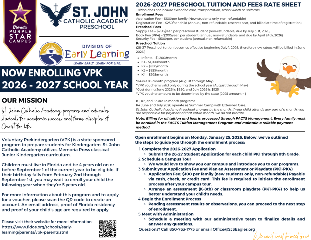 St. John Catholic Academy prepares and educates students for academic success and forms disciples of Christ for life.
