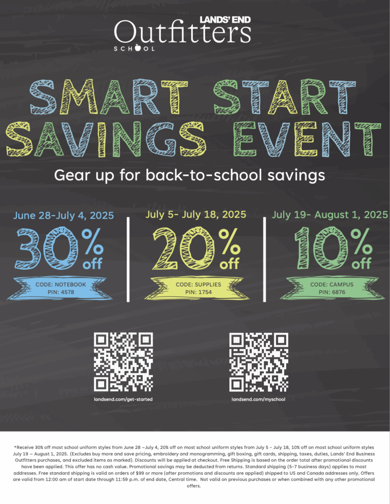 We invite you to take a look at the attached graphic and take advantage of the special coupons for school uniforms at Lands’ End! These savings are perfect for getting ready for the upcoming school year. Don’t miss out on these great deals! To start shopping, click here: SJCA Lands’ End